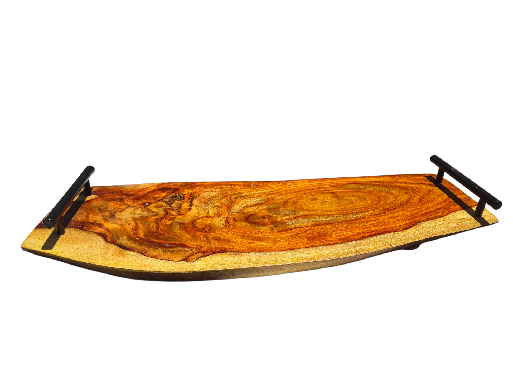 Add a touch of natural sophistication to your space with this stunning serving tray, handcrafted from rich Sarso (Sissoo) wood. Its beautiful grain patterns and warm tones make it a perfect centerpiece for entertaining or everyday use. Whether you're serving snacks, drinks, or breakfast in bed, the durable wood and sleek black handles provide both style and practicality. A unique piece that blends rustic charm with modern design—ideal for any home or thoughtful gift.